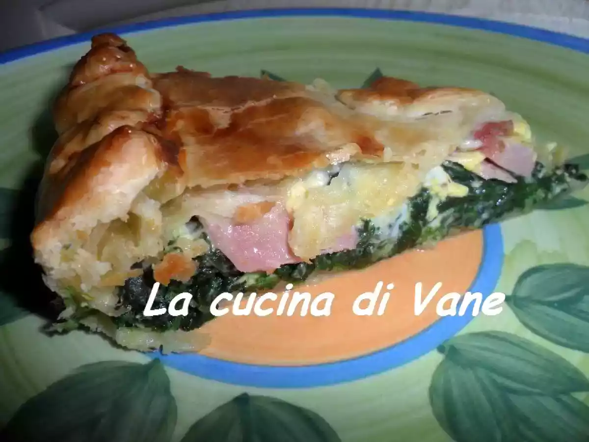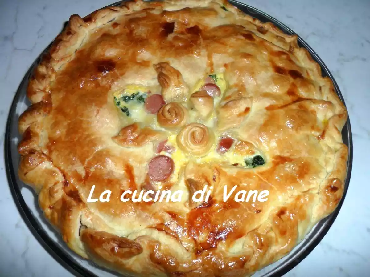 Torta rustica ripiena PrecedenteProssimo Portata principalemedia50 min Invia questa ricetta ad un amico Stampa la ricetta Contatta l'autore della Ricetta Pubblica la foto di questa ricetta Ingredienti 8 Per la "Torta rustica ripiena" gli ingredienti sono: 2 rotoli di pasta brisè 1 kg di spinaci lessati 1 pacchetto di wuster 4 fette prosciutto cotto 4 sottilette 2 uova latte mezzo bicchiere sale e pepe q.b.