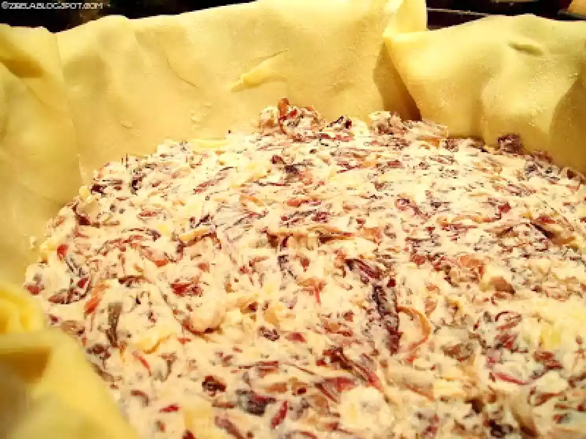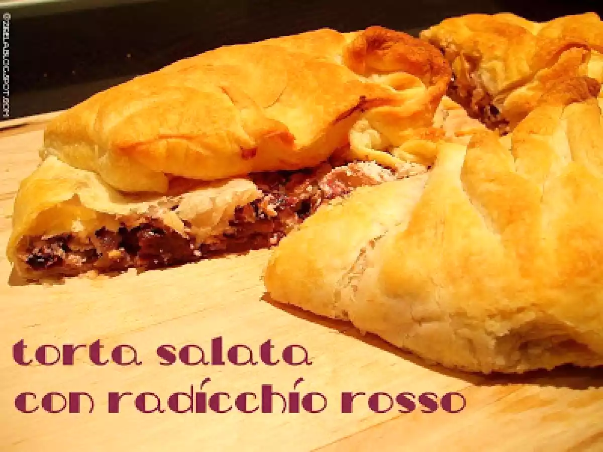 Torta salata con radicchio rosso PrecedenteProssimo Portata principalefacile55 min346 Kcal Invia questa ricetta ad un amico Stampa la ricetta Contatta l'autore della Ricetta Pubblica la foto di questa ricetta Un sale passo come tutti gli altri dolci ordinarie torta Ingredienti 6 1 rotolo di pasta sfoglia 1 pianta di radicchio rosso 250 g di ricotta 100 g di formaggio filante dal sapore intenso 1/2 cipolla rossa noce moscata olio extravergine d'oliva sale pepe Costo stimato: 5.6Euros€ (0.93€/Porzioni)