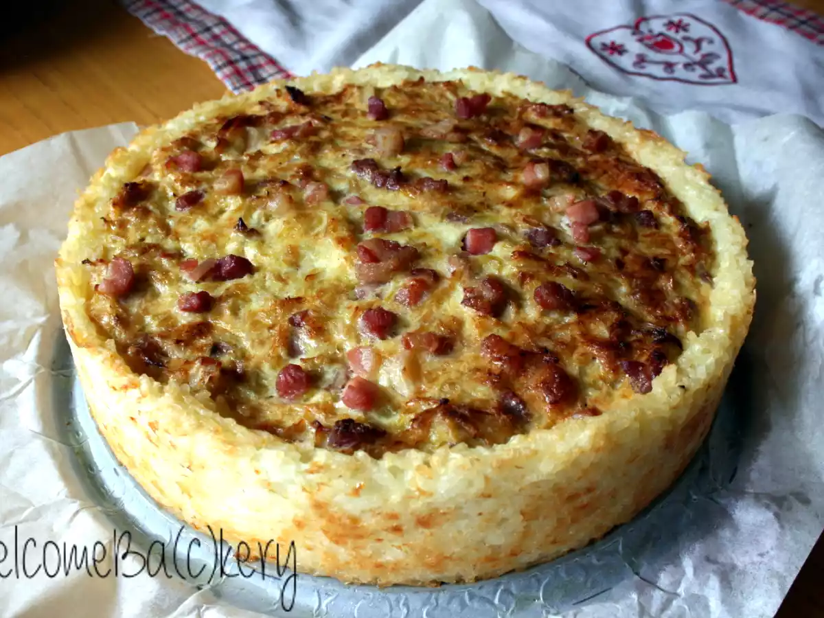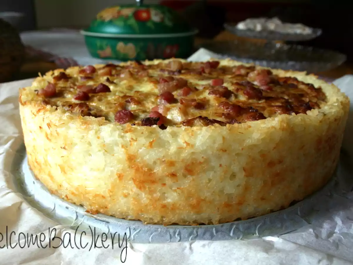Torta salata di porri, verza e pancetta in crosta di riso