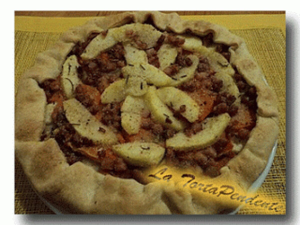Torta salata di zucca e mele. vota adesso PrecedenteProssimo Portata principalefacile1 h 5 m Invia questa ricetta ad un amico Stampa la ricetta Contatta l'autore della Ricetta Pubblica la foto di questa ricetta Ingredienti 5 1 rotolo di pasta brisé 1 pezzo di zucca mondato di circa 500 g 2 mele golden medio-piccole 100 g di pancetta affumicata pan grattato rosmarino aglio secco tritato fine sale 1 macinata di misto di pepe