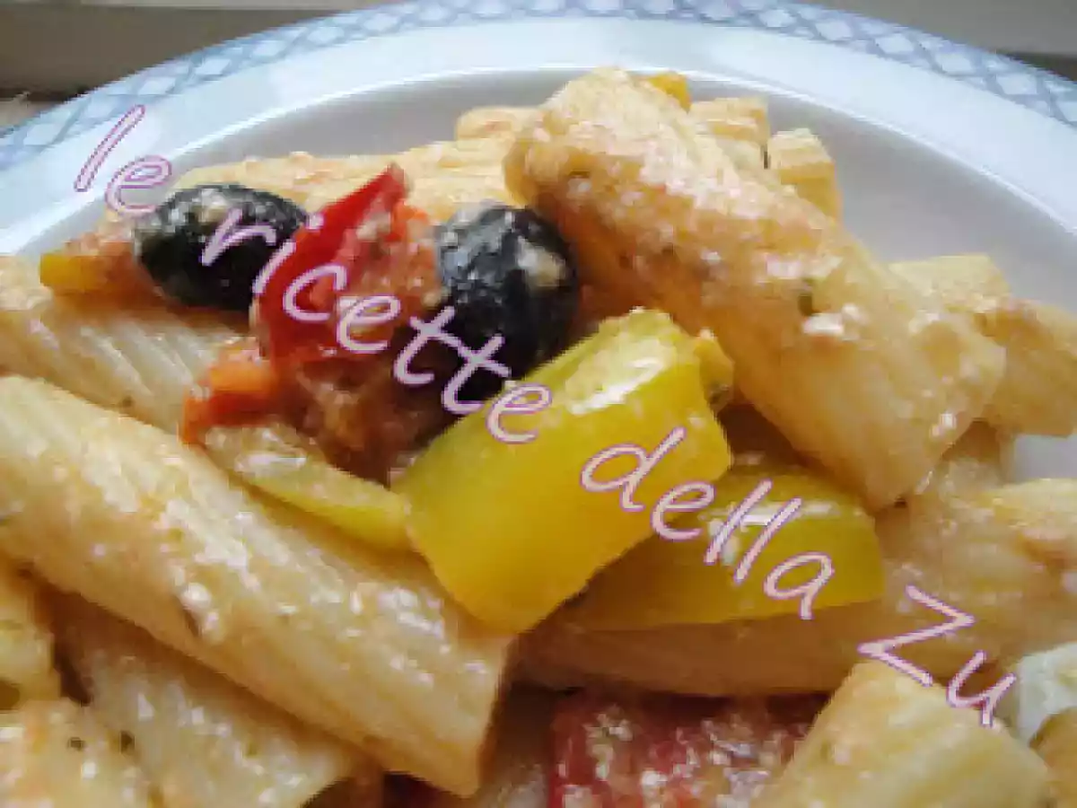 - Toglietelo quando sarà biondo e aggiungete: il peperone già lavato, privato di semi e filamenti e taglito a pezzi, le olive a metà e i pomodorini lavati e tagliati a spicchietti.