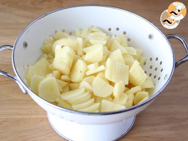 Versate l'olio in una padella, aggiungete le cipolle e fatele friggere leggermente. Poi aggiungete le patate.