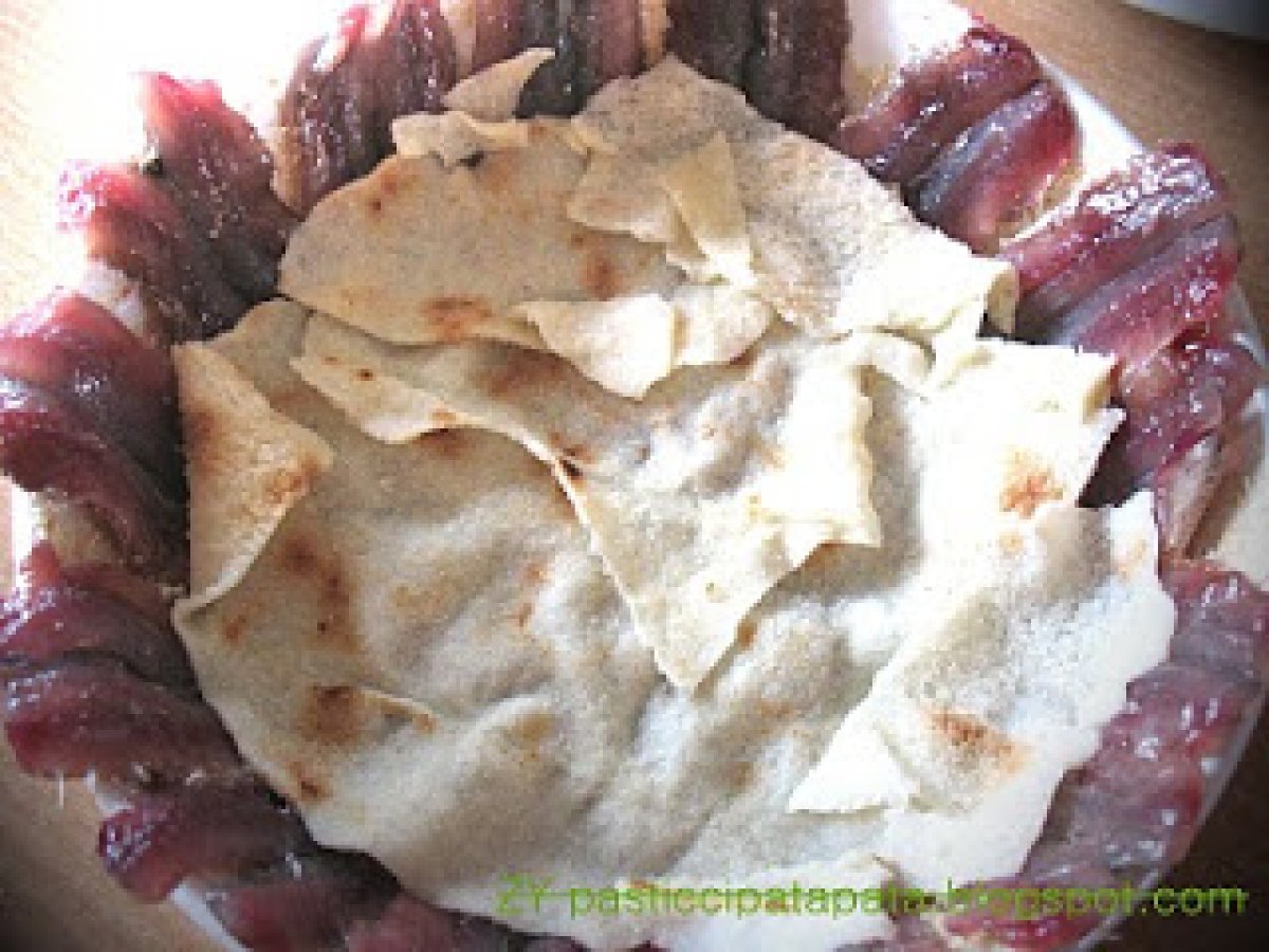 Tortino di alici con pane carasau PrecedenteProssimo Portata principalefacile1 ora Invia questa ricetta ad un amico Stampa la ricetta Contatta l'autore della Ricetta Pubblica la foto di questa ricetta Ingredienti 3 una dozzina di alici 2 grandi "fette" di pane carasau 250 g di passata di pomodoro con i pezzi di pomodoro una manciata di capperi dissalati 1/2 cipolla rossa origano, sale, peperoncino olio extravergine d'oliva pangrattato
