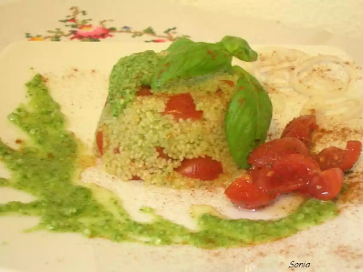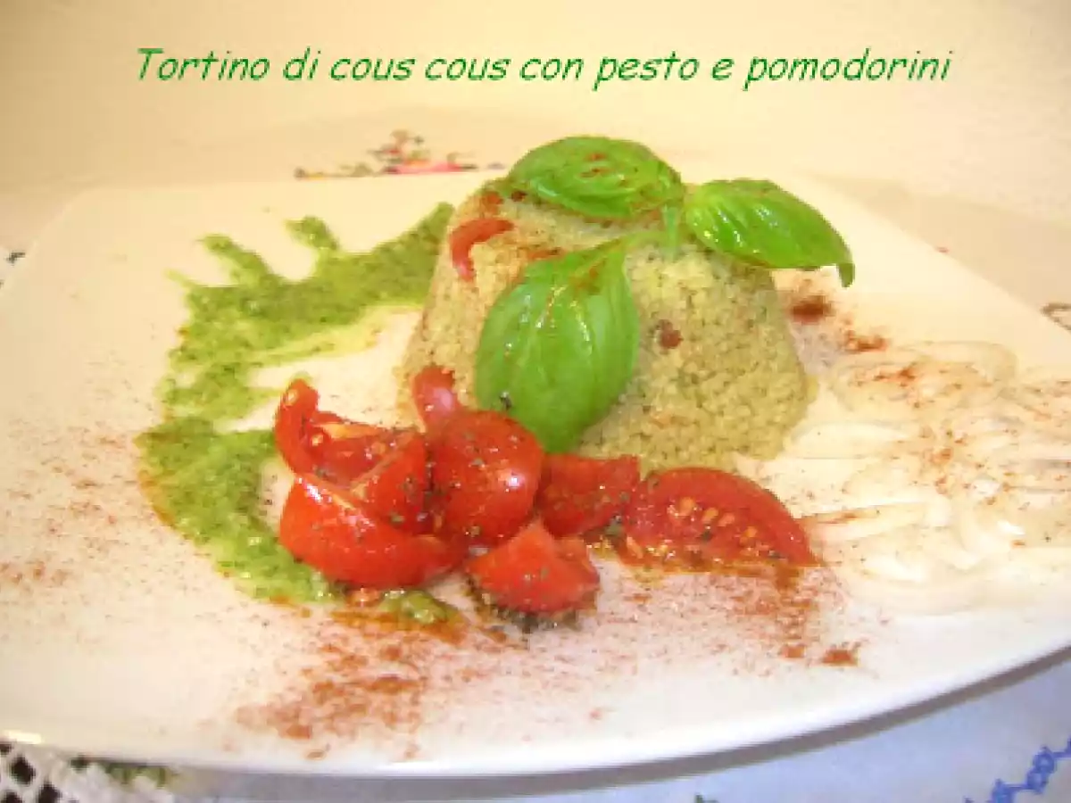 Tortino di cous cous al profumo di pesto e pomodorini PrecedenteProssimo Portata principalefacile40 min Invia questa ricetta ad un amico Stampa la ricetta Contatta l'autore della Ricetta Pubblica la foto di questa ricetta Oggi ci sono in couscous per il pranzo. Ingredienti 4 250 ml di salamoia 250g couscous Pesto Pomodorini Un filo d'olio d'oliva Un po 'di origano Una noce di burro