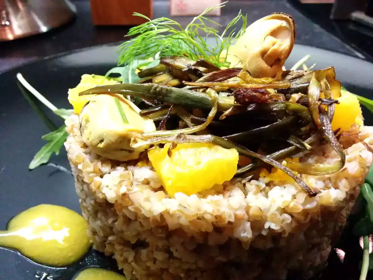 Tortino di farro integrale con carciofi croccanti e cozze al profumo d'arancia