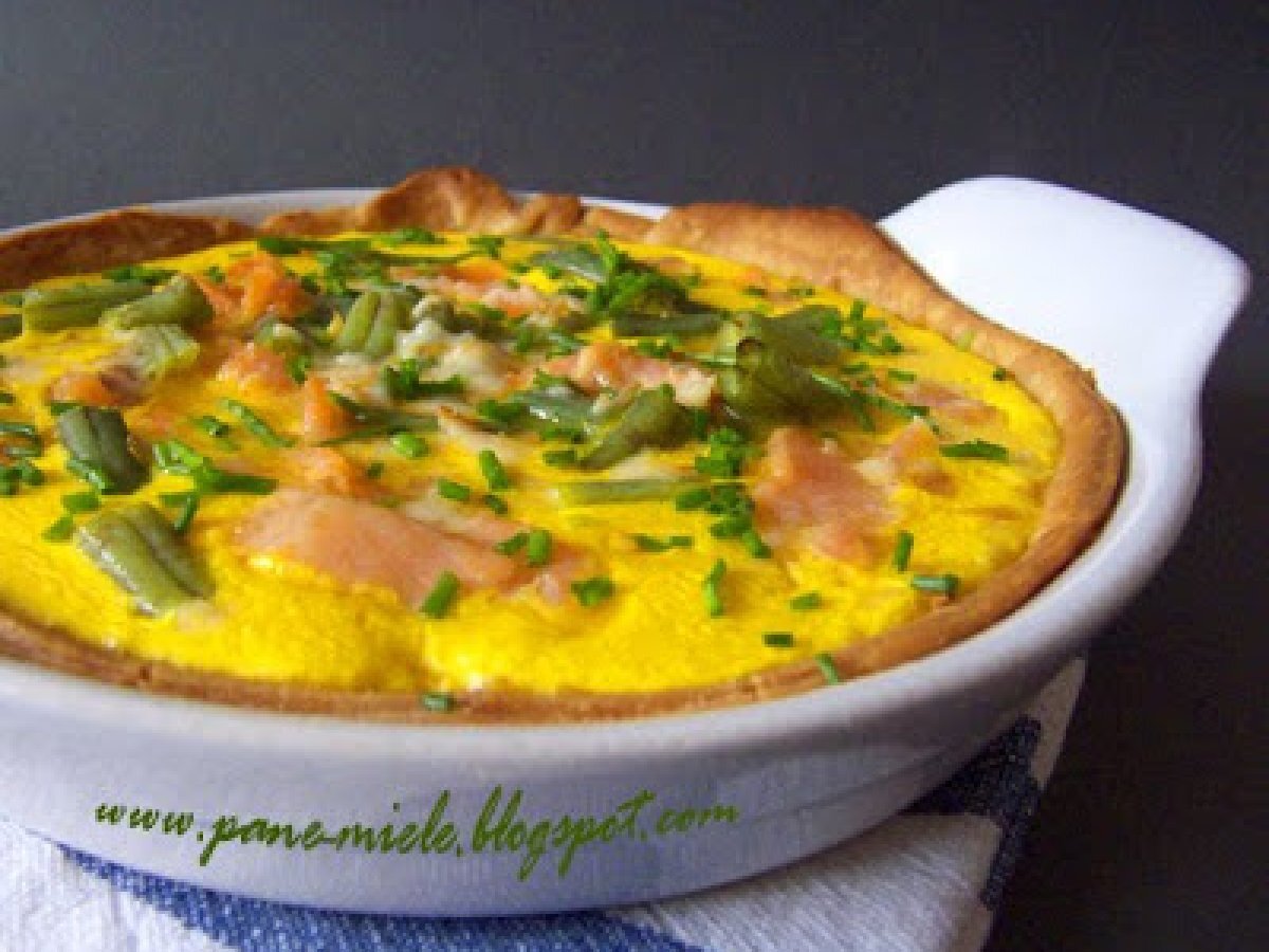 Tortino saporito con ricotta, fagiolini e salmone affumicato PrecedenteProssimo Portata principalefacile57 min Invia questa ricetta ad un amico Stampa la ricetta Contatta l'autore della Ricetta Pubblica la foto di questa ricetta Ingredienti 2 150 g di pasta sfoglia 100 g di ricotta 100 g di salmone affumicato 80 g di fagiolini freschi 5 g di burro 1 tuorlo erba cipollina 1 dl di panna acida sale pepe fagioli secchi per la cottura in bianco Costo stimato: 7.47Euros€ (3.73€/Porzioni)