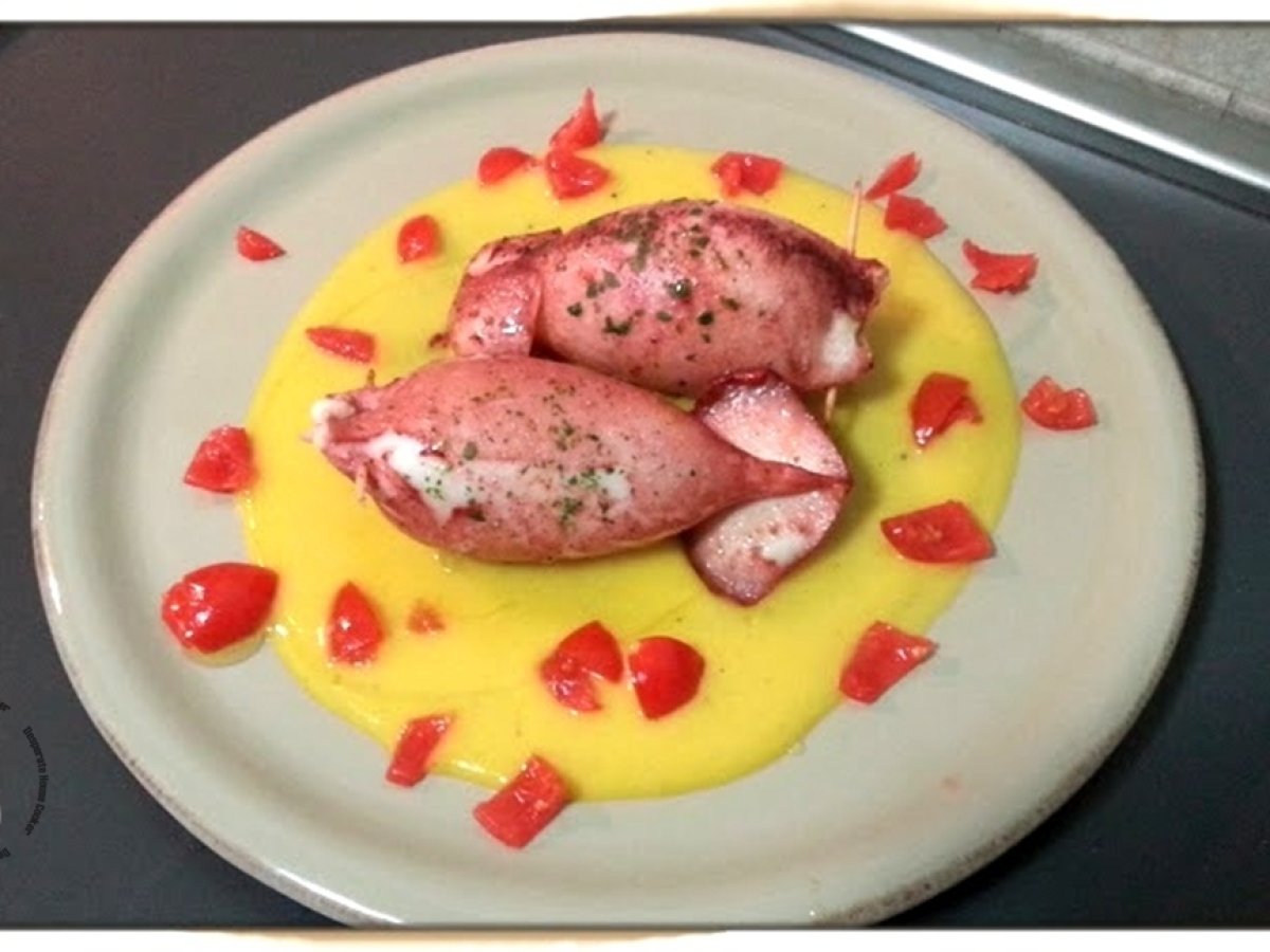 Finalmente è sabato e ieri sera, una volta tanto, ho voluto seguire la tradizione che dice di mangiare pesce il venerdì. Ma l'ho fatto a modo mio reinterpretando un classico della cucina ligure, i totani ripieni. Cucinati in maniera classica ma serviti su una profumatissima crema di patate allo zafferano con una dadolata di pomodori ciliegini per rinfrescare il piatto.