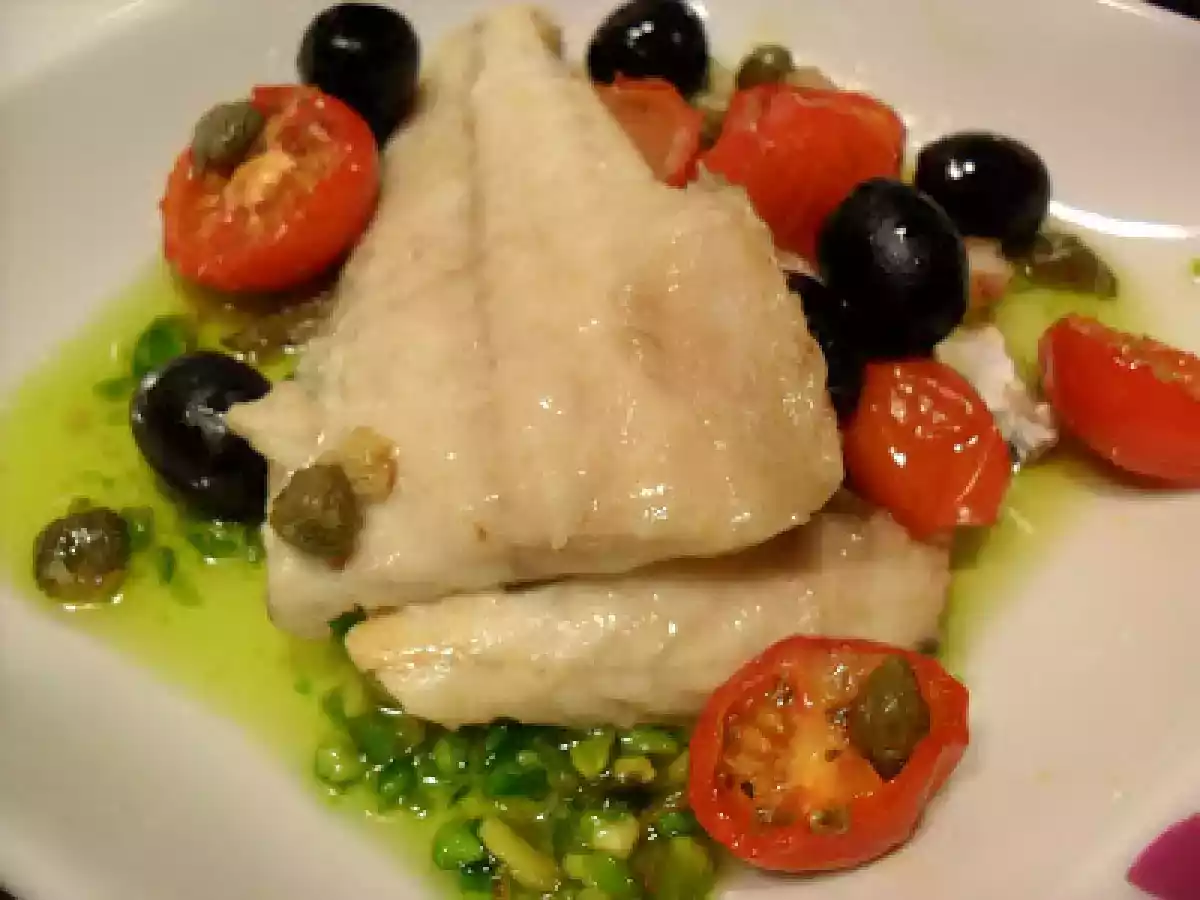 Trancio di branzino su salsa di pistacchi, capperi, olive nere e pomodorini confit PrecedenteProssimo Portata principalefacile1 ora Invia questa ricetta ad un amico Stampa la ricetta Contatta l'autore della Ricetta Pubblica la foto di questa ricetta Ingredienti 4 1 branzino capperi olio extra vergine d'oliva una manciata di pistacchi olive nere pomodorini confit home made sale