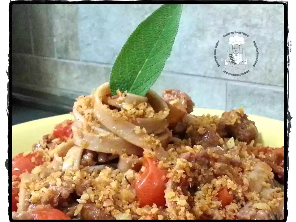 L'altra sera stavo guardando il programma "Cucina con Ramsey" ed ha presentato un modo veloce per fare un ottimo sugo di salsiccia, ho preso spunto ed ho modificato la ricetta secondo il mio gusto personale. Ho aggiunto del pane carasao tritato, mischiato con del pecorino stagionato e tostato in padella con un filo d'olio evo per aumentare, se possibile, il sapore ed il profumo del piatto.