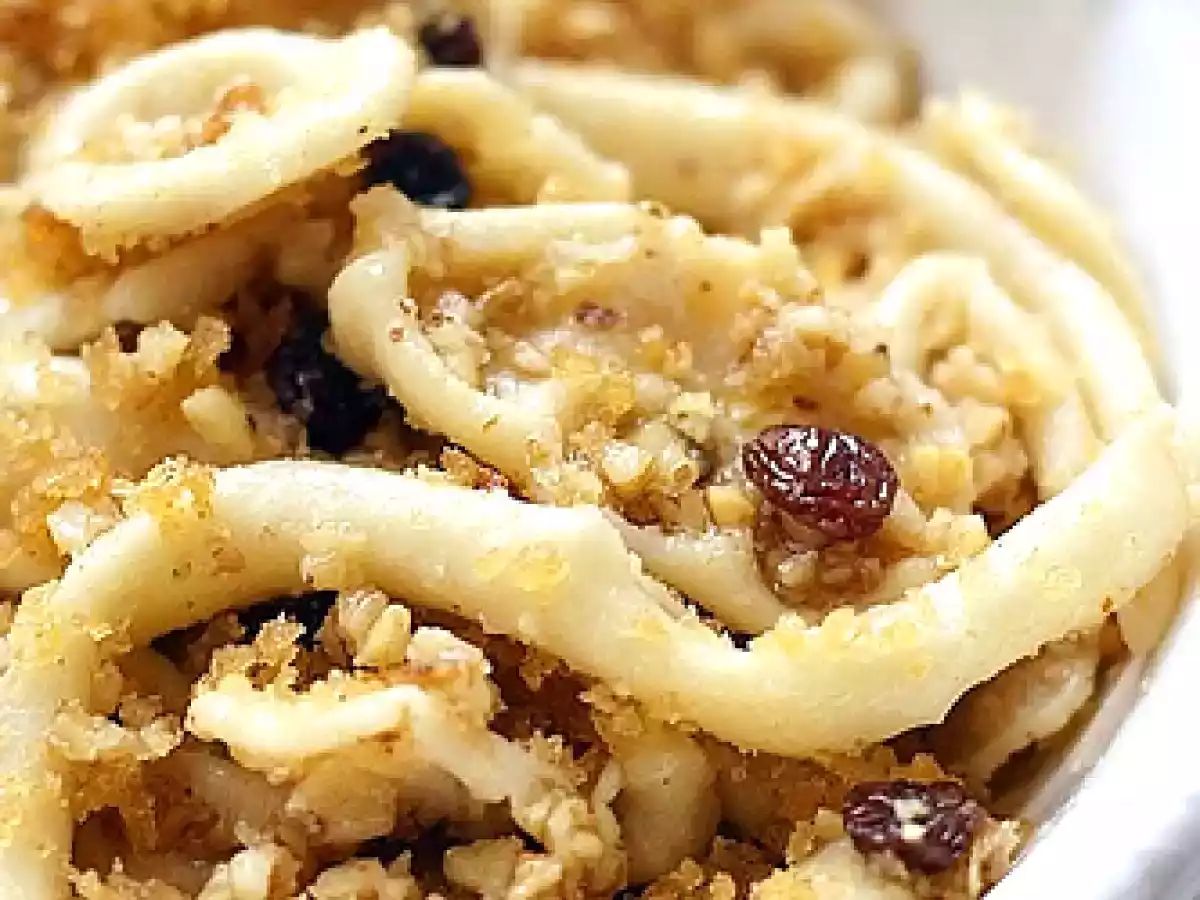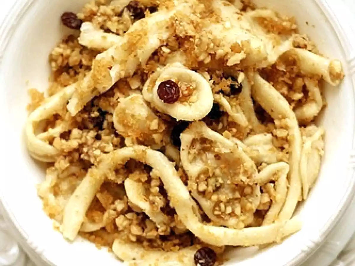 Trittico lucano con la mollica, noci, mandorle e uva passa. PrecedenteProssimo Portata principalefacile55 min Invia questa ricetta ad un amico Stampa la ricetta Contatta l'autore della Ricetta Pubblica la foto di questa ricetta Ingredienti 4 per l'impasto: 330 g di farina di semola rimacinata 150 g di acqua tiepida per il condimento: 250 g di mollica di pane casereccio grattugiata finemente, meglio se di qualche giorno prima. 50 g di mandorle 60 g di noci 25 g di uvetta un pizzico di polvere di peperoni cruschi olio extra vergine di oliva uno spicchio di aglio Costo stimato: 4.47Euros€ (1.12€/Porzioni)