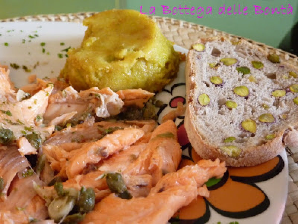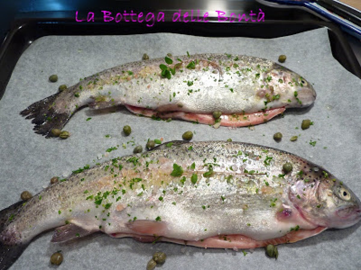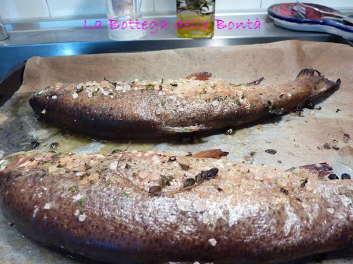 Trote salmonate al sale rosa dell'himalaya PrecedenteProssimo Portata principalefacile30 min318 Kcal Invia questa ricetta ad un amico Stampa la ricetta Contatta l'autore della Ricetta Pubblica la foto di questa ricetta Ingredienti 2 2 trote salmonate di fiume 1 spicchio di aglio 2 cucchiai di olio evo 2 rametti di timo 1 cucchiai di capperi 1 ciuffo di prezzemolo 2 cucchiai di sale rosa dell'himalaya. 1/2 bicchiere di vino bianco