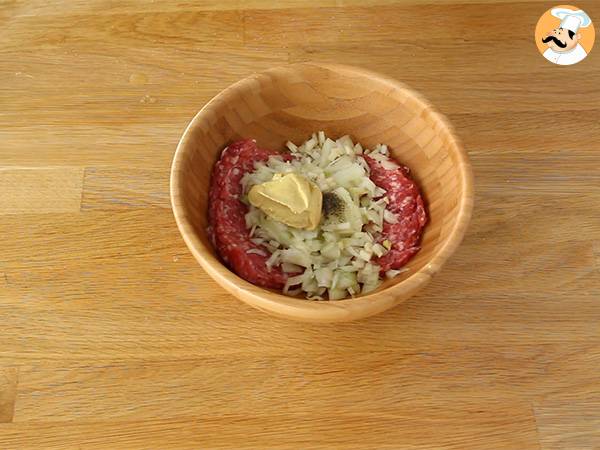 Preparate le uova sode: Mettetele in un pentolino con acqua fredda e cuocetele per 8 minuti. Mescolate la salsiccia sbriciolata con la cipolla tagliata a pezzetti, l'aglio (sempre tagliato a pezzetti) e la senape. Salate e pepate.
