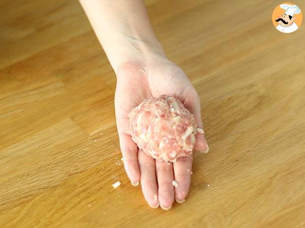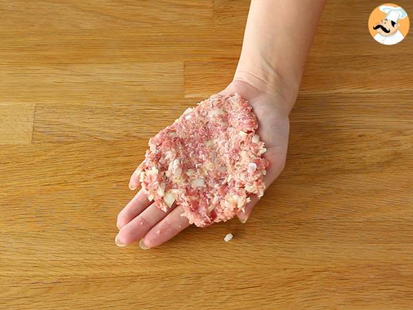 Quando le uova sono pronte sgusciatele. Poi prendete 1 quarto della preparazione a base di carne e appiattitelo sulla vostra mano