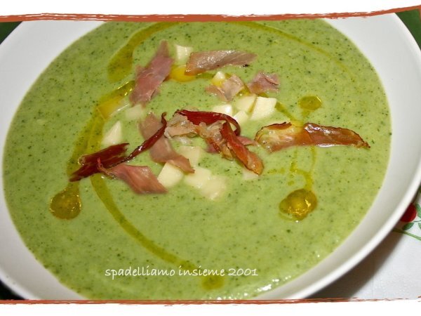 Vellutata di broccoli con speck croccante e fonduta di formaggio