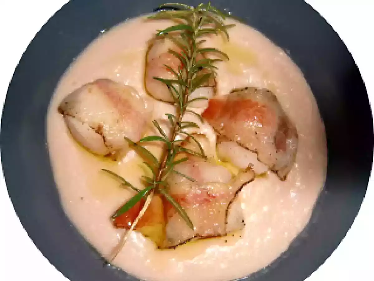 Vellutata di cannellini con cappesante bardate e olio al rosmarino vota adesso Portata principalefacile35 min Invia questa ricetta ad un amico Stampa la ricetta Contatta l'autore della Ricetta Pubblica la foto di questa ricetta Ingredienti 2 Per la passata i cannellini: 200 gr di cannellini Brodo vegetale qb sale e pepe qb Per le cappesante: 8 cappesante pulite e private del corallo 8 fette di guanciale, o lardo, se volete un gusto meno "carnoso" Per l'olio al rosmarino: Olio extravergine di oliva 2 rami di rosmarino fresco