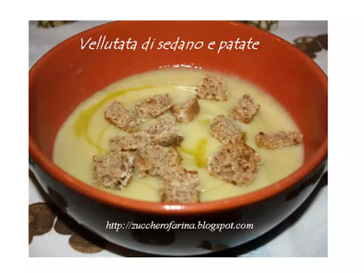 Vellutata di sedano e patate Portata principalefacile50 min184 Kcal Invia questa ricetta ad un amico Stampa la ricetta Contatta l'autore della Ricetta Pubblica la foto di questa ricetta Ingredienti 4 1 gamba di sedano 2 patate grandi ¼ cipolla Olio evo Costo stimato: 0.55Euros€ (0.14€/Porzioni)