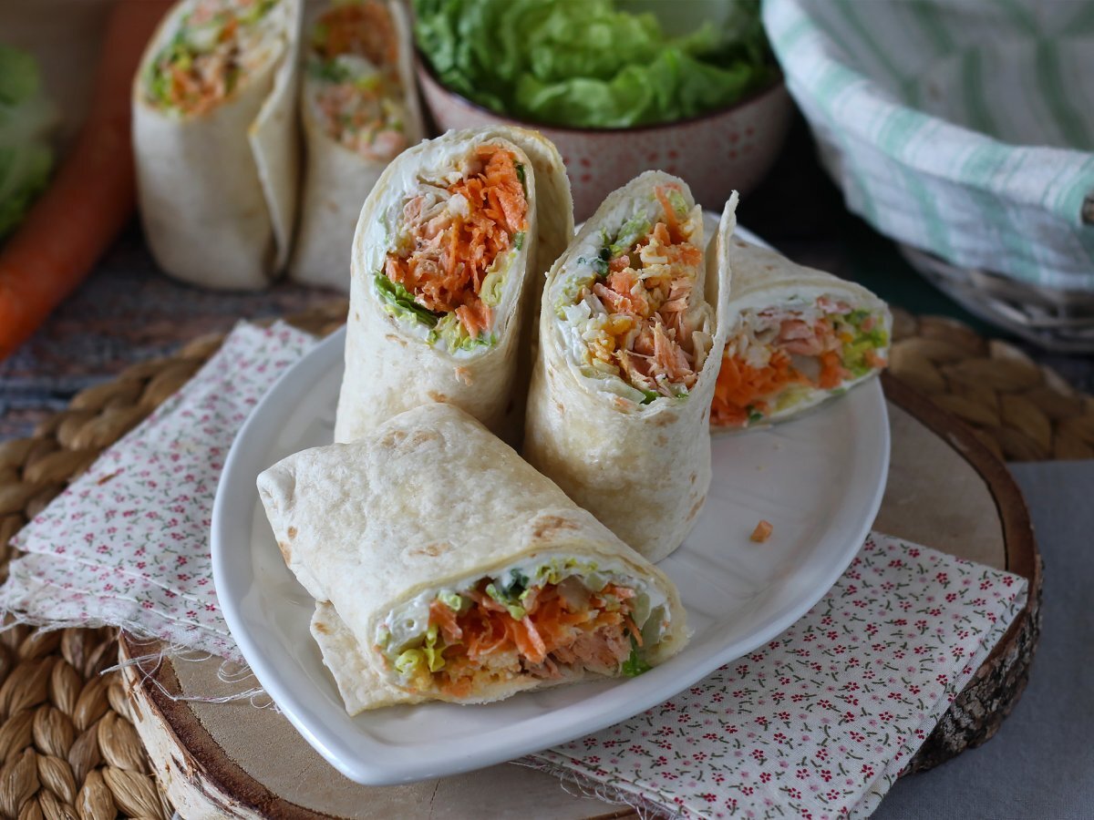 Questa gustosa ricetta con salmone cotto a microonde (per risparmiare tempo), carote e insalata sarà perfetta per cena ma anche per un pranzo rapido in ufficio. Provate anche voi i nostri super wraps, li amerete alla follia. Seguite la ricetta dettagliata per preparare alla perfezione questo fresco sandwich da acquolina in bocca e non esitate ad apportare qualche modifica (nella sezione consigli, a fondo pagina, troverete diverse opzioni da provare!