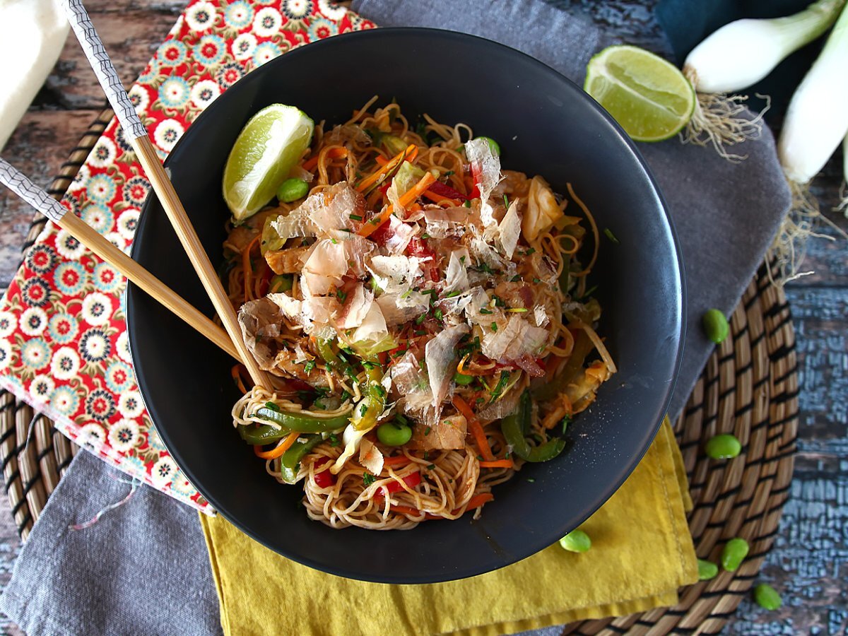 Potete anche sostituire i noodles soba con i noodles udon più spessi, così otterrete gli Yakiudon.