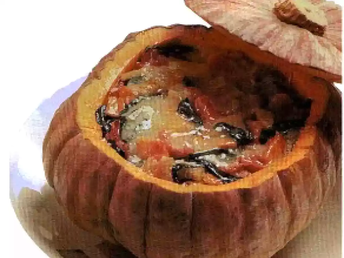 Zucca ripiena vota adesso Portata principalefacile1 h 45 m Invia questa ricetta ad un amico Stampa la ricetta Contatta l'autore della Ricetta Pubblica la foto di questa ricetta Ingredienti 6 1 zucca di 1,750 kg 300 g di erbette 300 g di patate 200 g di fontina 2 cipolle 100 g di prosciutto cotto a fette 6 cucchiai di parmigiano grattugiato olio di oliva sale pepe