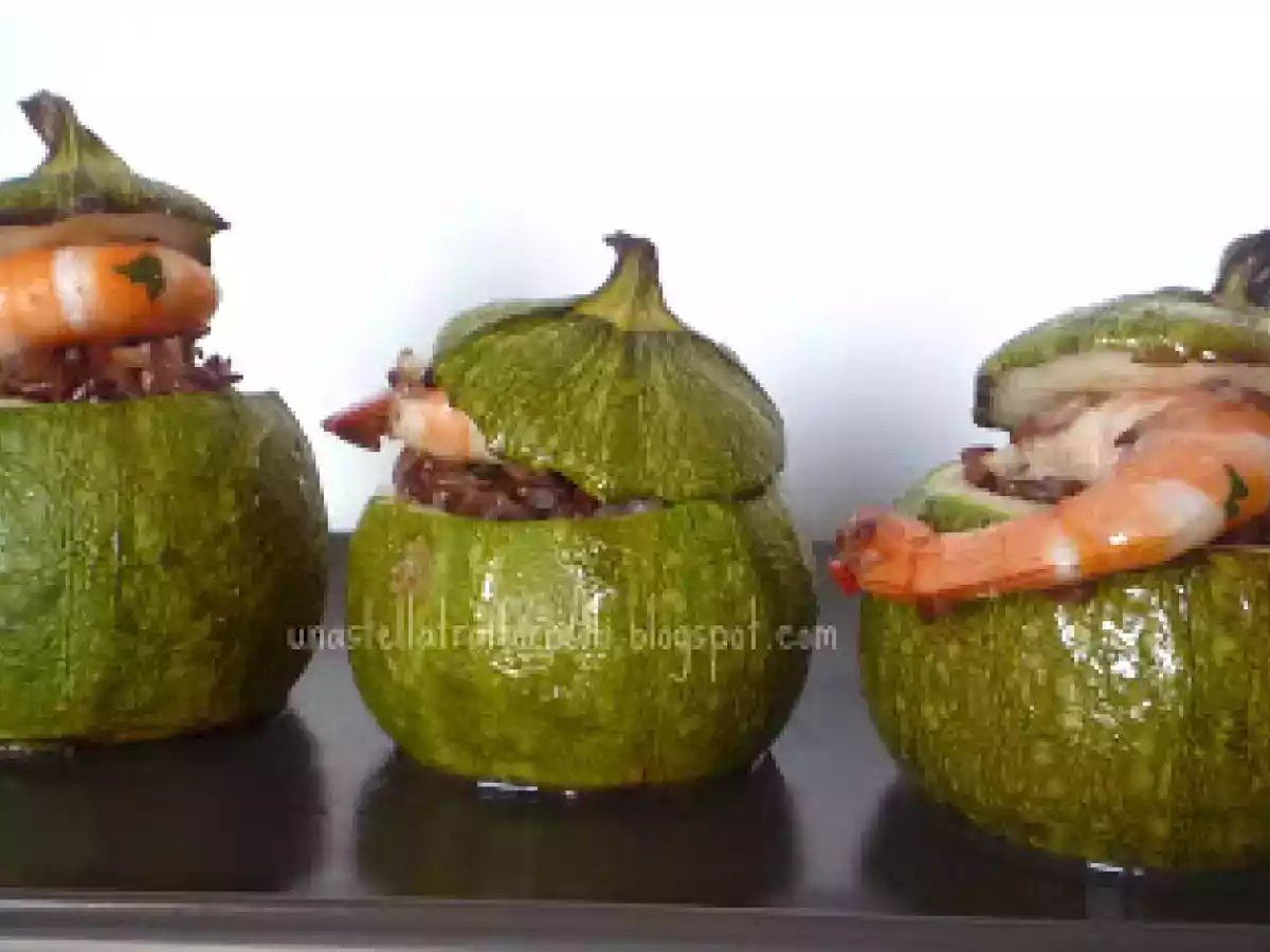Zucchine tonde ripiene di riso venere rosso e mazzancolle vota adesso Portata principalemedia6 h 30 m Invia questa ricetta ad un amico Stampa la ricetta Contatta l'autore della Ricetta Pubblica la foto di questa ricetta Ingredienti 4 3 zucchine tonde 250 gr riso venere rosso 250 gr mazzancolle 1/2 scalogno 1/2 bicchiere vino bianco secco prezzemolo brodo vegetale granulare olio evo peperoncino 1 zucchina lunga