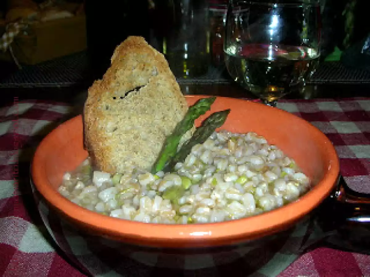 Zuppa di farro con asparagi selvatici PrecedenteProssimo Portata principalefacile55 min343 Kcal Invia questa ricetta ad un amico Stampa la ricetta Contatta l'autore della Ricetta Pubblica la foto di questa ricetta Ingredienti 2 150 g di farro 1 mazzetto di asparagi selvatici 1 scalogno 1 spicchio d'aglio 2 cucchiai di olio evo 50 ml di vino bianco sale cumino prezzemolo tritato brodo vegetale peperoncino grana grattugiato