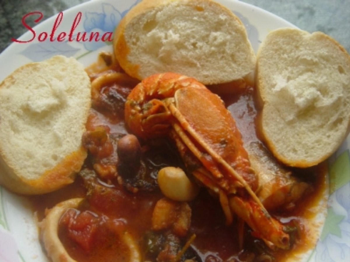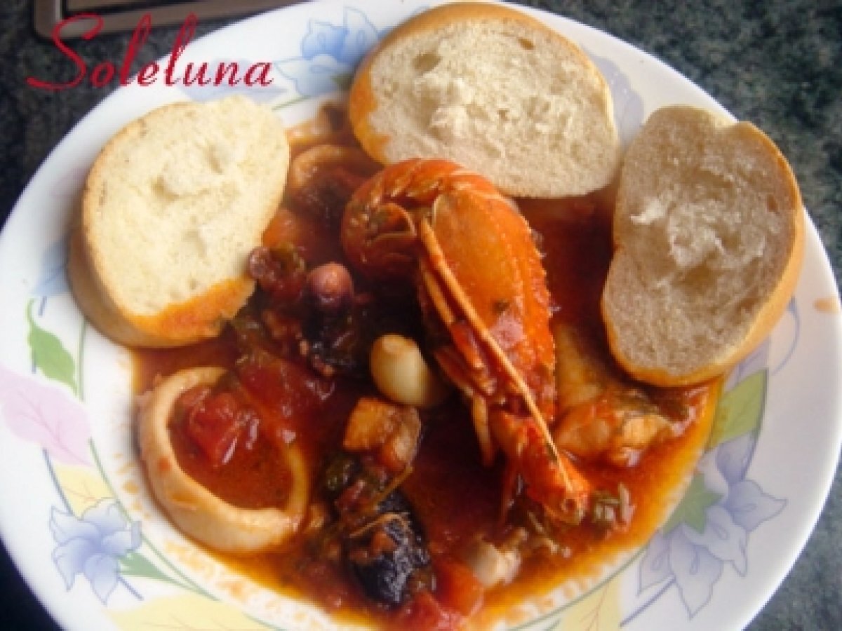 Zuppa di pesce vota adesso PrecedenteProssimo Portata principalefacile1 ora Invia questa ricetta ad un amico Stampa la ricetta Contatta l'autore della Ricetta Pubblica la foto di questa ricetta Ingredienti 5 1 kg di pesce surgelato per zuppa, scongelato sono 8 etti conteneva: tranci di nasello cozze tranci di gallinella, seppie calamari gamberoni cicale 1 scatola di polpa pronta ½ bicchiere di vino bianco 1 mazzetto di prezzemolo 1 pezzetto di peperoncino 4 cucchiai di olio evo mezza cipolla 1 spicchio di aglio sale e pepe