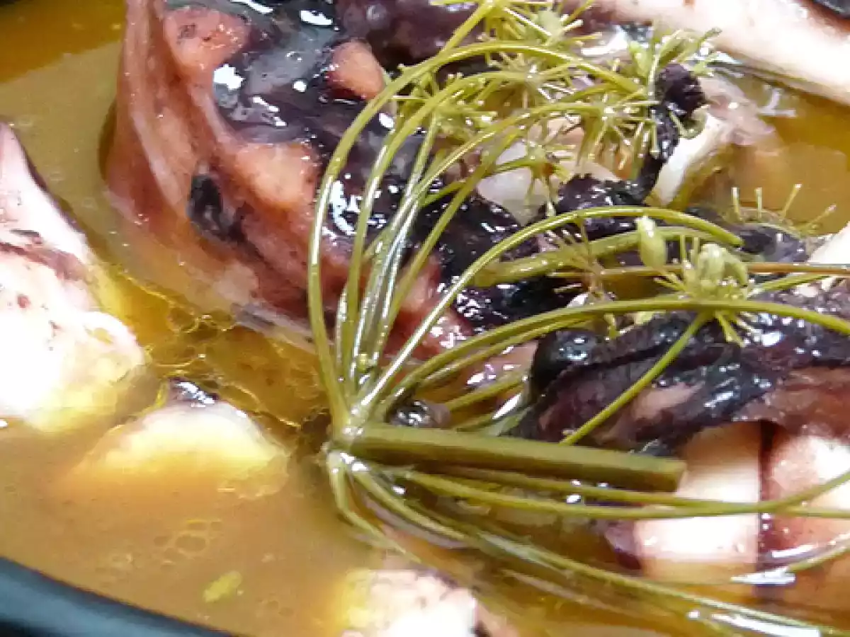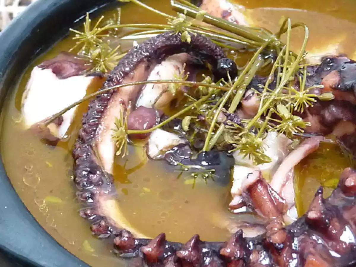 Zuppa di polpo al finocchietto selvatico e ginepro PrecedenteProssimo Portata principalefacile55 min Invia questa ricetta ad un amico Stampa la ricetta Contatta l'autore della Ricetta Pubblica la foto di questa ricetta Ingredienti 4 700 g di polpo 1 spicchio d'aglio intero 1 acciuga all'olio 1 piccolo peperoncino 3/4 bacche di ginepro 1 piccolo bicchiere di Vermouth bianco 1 rametto di finocchietto selvatico Olio evo qb.