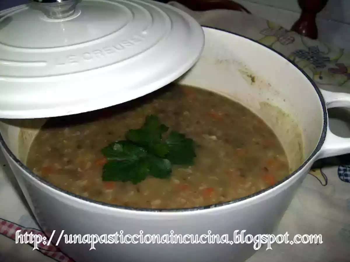 Zuppa di riso e legumi in cocotte le creuset vota adesso Portata principalefacile55 min Invia questa ricetta ad un amico Stampa la ricetta Contatta l'autore della Ricetta Pubblica la foto di questa ricetta Ingredienti 4 1 busta da 500 g di Zuppa Riso e Legumi MELANDRI GAUDENZIO 1/4 di cipolla mezzo bicchiere di olio di semi di mais DANTE 1 spicchio di aglio sedano 1 carota tagliata a cubetti 1 dado vegetale sale q.b. peperoncino piccante 50 g di pancetta tagliata a cubetti