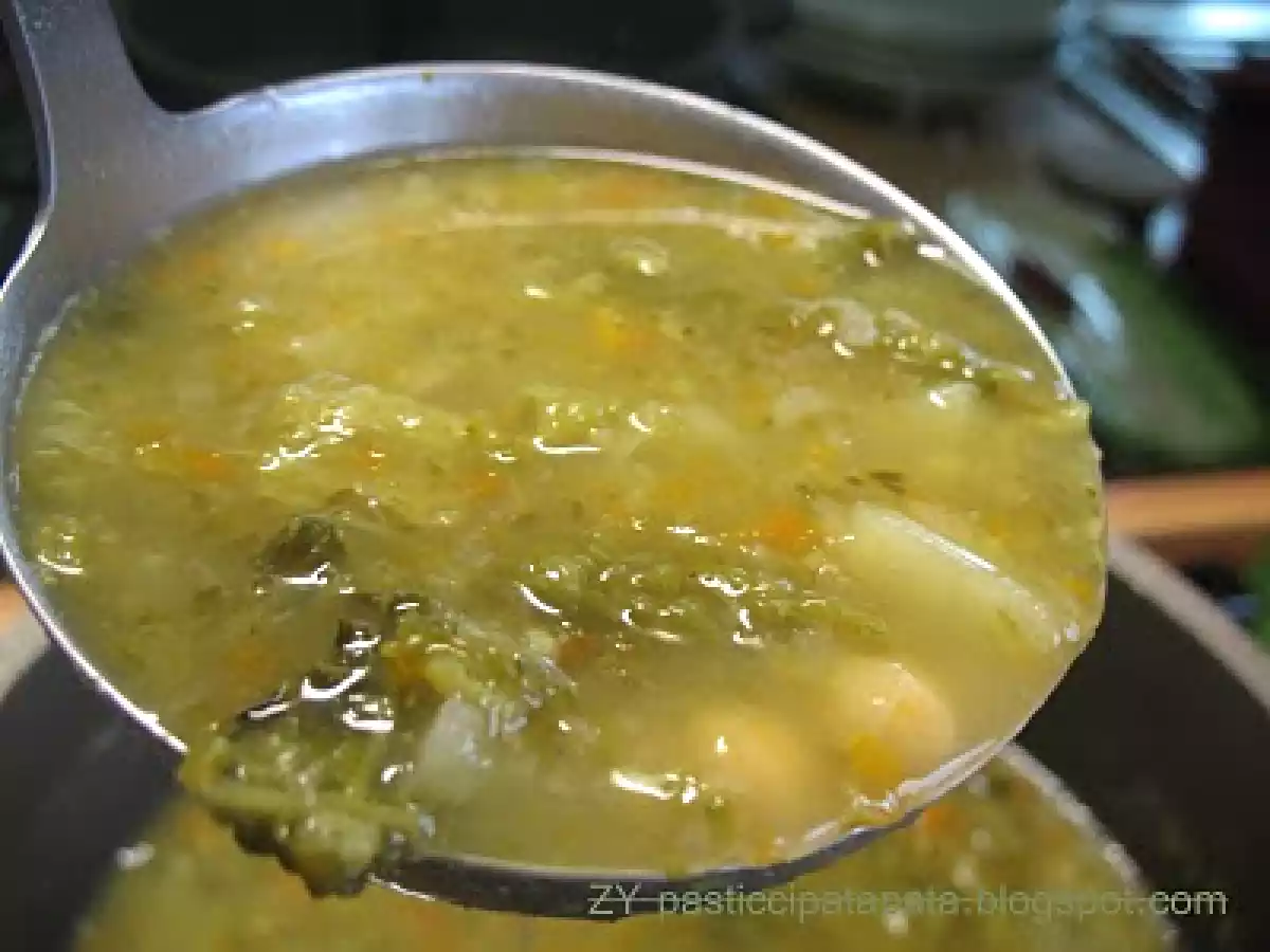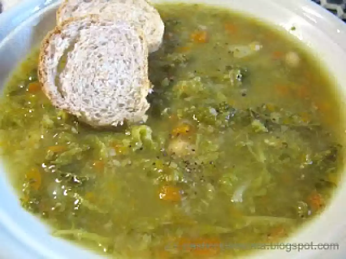 Zuppa di verza e ceci PrecedenteProssimo Portata principalefacile50 min Invia questa ricetta ad un amico Stampa la ricetta Contatta l'autore della Ricetta Pubblica la foto di questa ricetta Ingredienti 3 1 verza piccola o metà di una grossa 1 carota 1/2 cipolla o scalogno 1 gambo di sedano 750 ml acqua calda salata o brodo 120 g di ceci secchi 1 patata media sale, pepe, olio