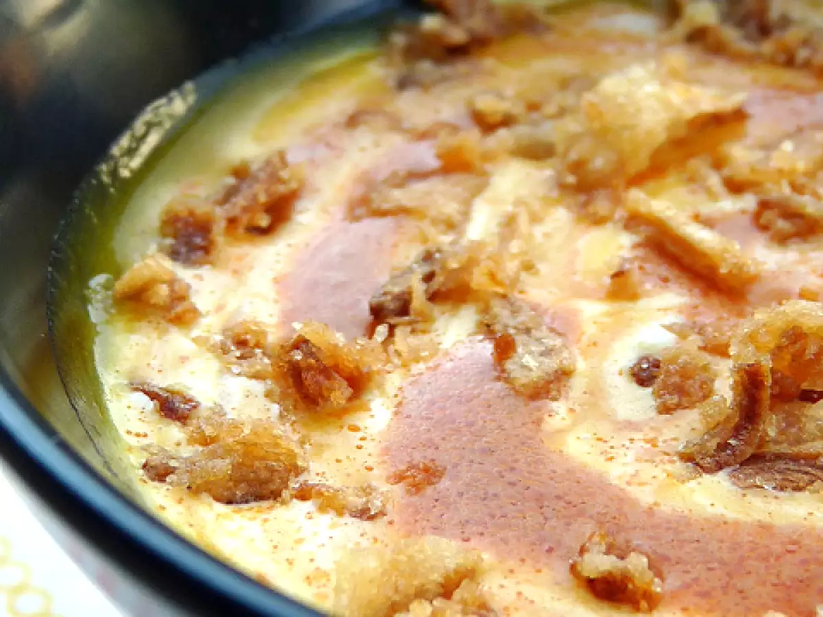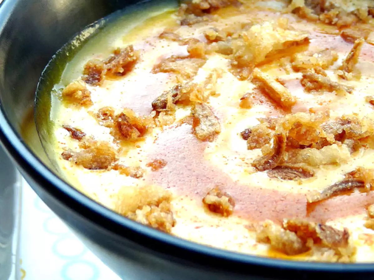 Zuppa di zucca con crema di chorizo e croccante di cipolle PrecedenteProssimo Portata principalefacile1 h 5 m Invia questa ricetta ad un amico Stampa la ricetta Contatta l'autore della Ricetta Pubblica la foto di questa ricetta Ingredienti 4 800 g di zucca, quella che preferite 2 patate 40 cl di brodo vegetale 15 cl di crème fraîche 100 g di chorizo dolce 1 cucchiaio di concentrato di pomodoro 20 cl di acqua noce moscata sale e pepe Per la cipolla croccante: 1 gossa cipolla bianca 1 cucchiaino di sale 1 cucchiaio di farina di riso 1 l. di olio per frittura