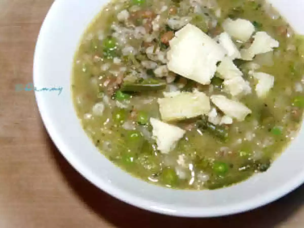 Zuppa verde Portata principalefacile55 min Invia questa ricetta ad un amico Stampa la ricetta Contatta l'autore della Ricetta Pubblica la foto di questa ricetta Ingredienti 2 70g di orzo 80g di piselli un sedano 10 fagiolini 1 cipolla 1 patata prezzemolo fresco (o congelato) pecorino pepe sale