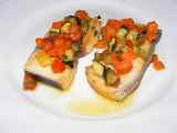 Ingredienti: 2 pomodori cuore di bue 200 gr di pesce spada affumicato 1/2 cucchiaio di capperi sotto sale 1/2 limone bio 1 rametto di menta fresca olio...
