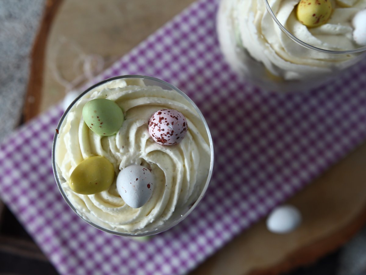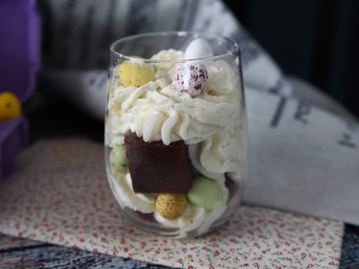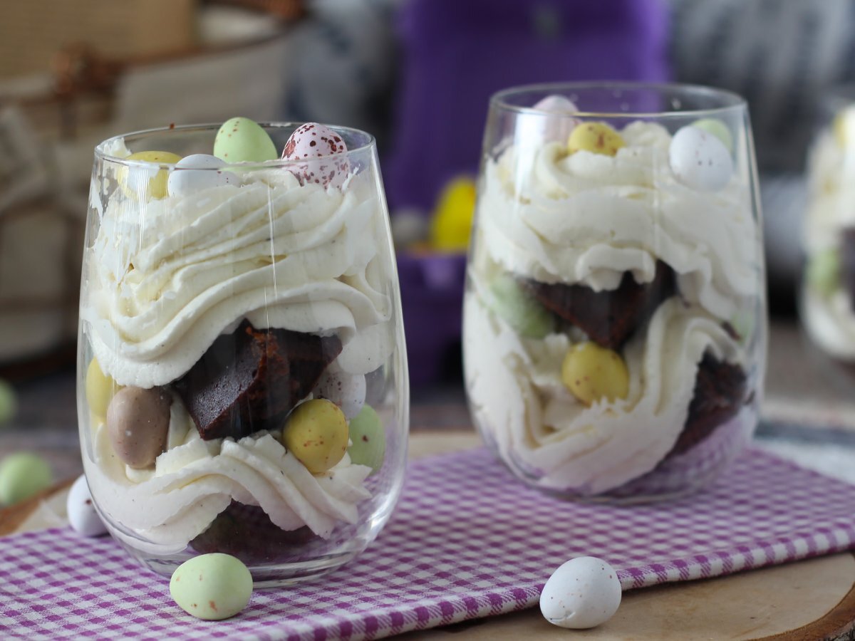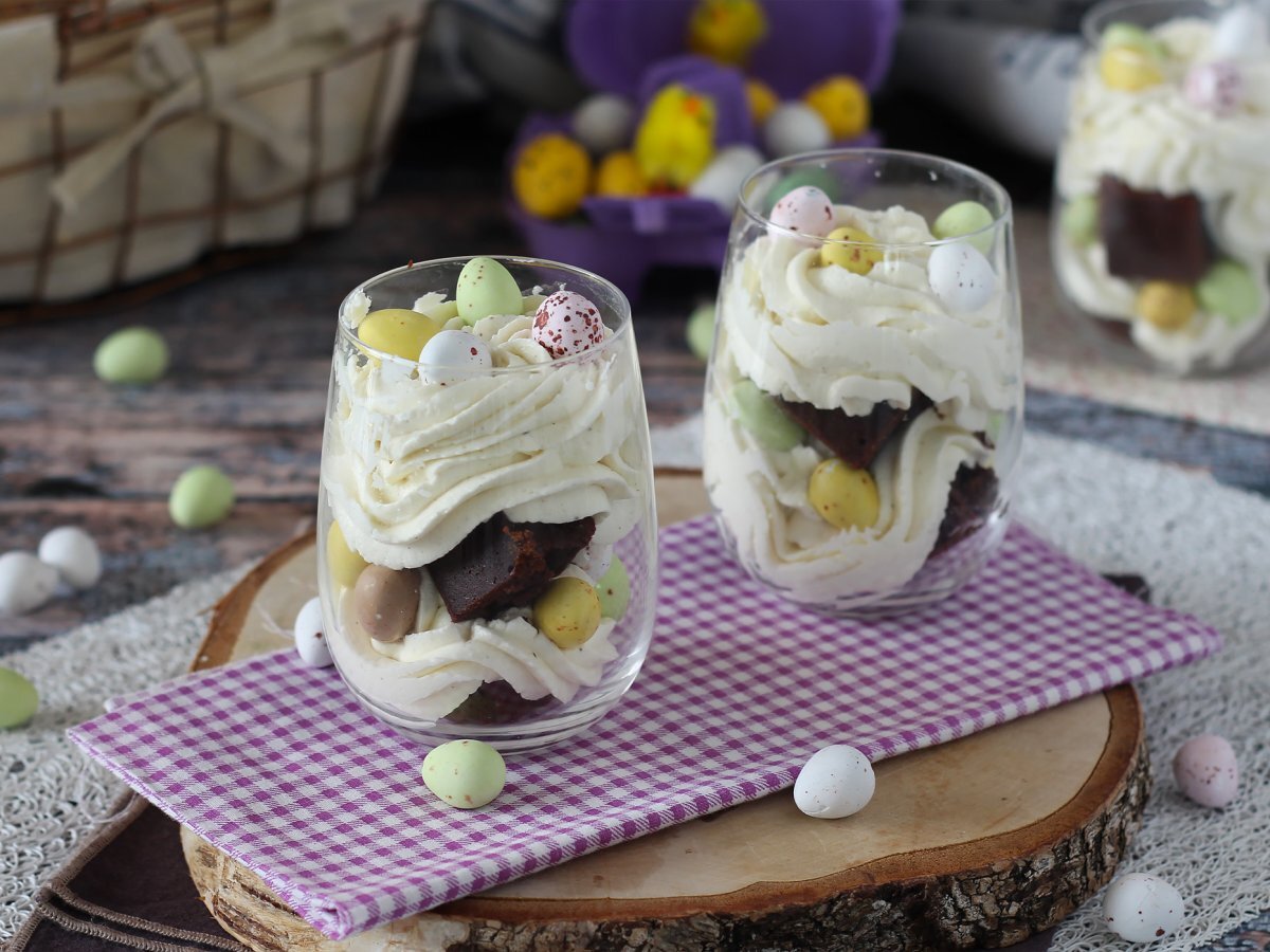 Mettete dei pezzi di brownie nei bicchierini, ricopriteli con la crema aiutandovi con un sac à poche (se l'avete). Poi aggiungete qualche ovetto colorato