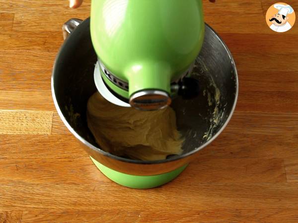 Mettete la farina, il sale e lo zucchero nella ciotola della planetaria. Aggiungete le uova e la preparazione lievito/latte. Azionate la planetaria a velocità 2 fino a quando l'impasto non si stacca dai bordi della ciotola