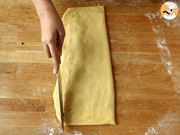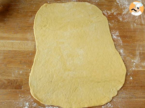 Togliete la pasta brioche dal frigo e sgasatela. Infarinate un piano da lavoro, poi anche l'impasto quindi stendetelo cercando di formare un rettangolo (circa 4/5mm di spessore)