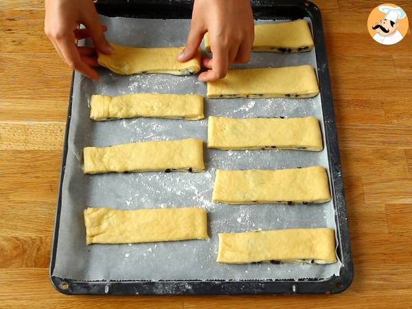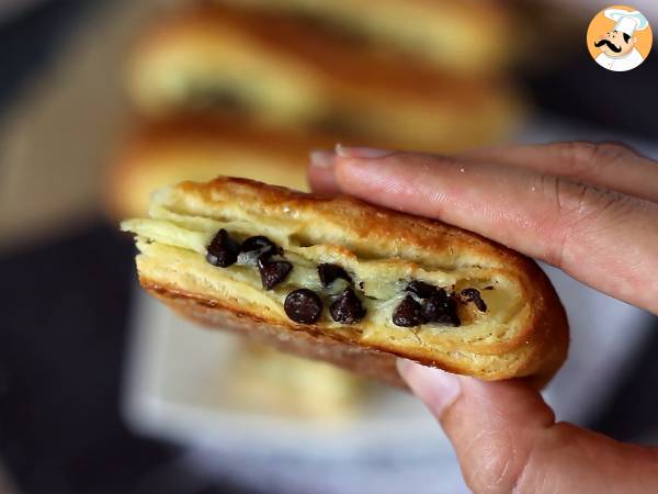 Spalmate la crema pasticcera sulla metà della superficie, poi aggiungete le gocce di cioccolato sulla crema (incastratele nella crema aiutandovi con una spatola ocon un cucchiaio)