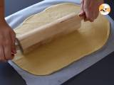 Passato il tempo di lievitazione, sistemate un foglio di carta forno su un piano da lavoro. Poi adagiatevi l'impasto sopra e stendetelo con il mattarello (la misura dovrà essere circa 30x40 cm)