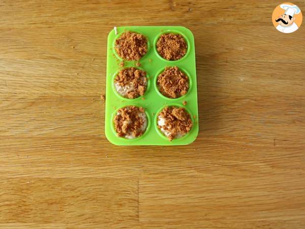 Ora mescolate il cioccolato bianco con metà degli speculoos triturati, poi versate la preparazione negli stampi. Quindi spolverate con altri speculoos triturati.