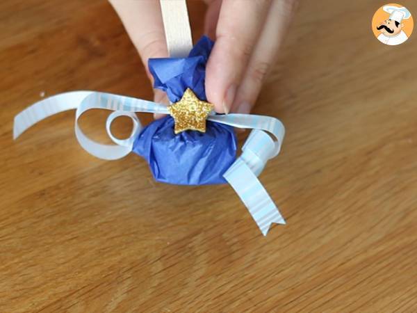 Adesso sformate i cioccolatini e adagiateli su dei quadrati di carta crespa. Richiudete e fate un nodo con il nastro. Per finire, arricciate il nastro con le forbici e incollate la stellina sul nodo.