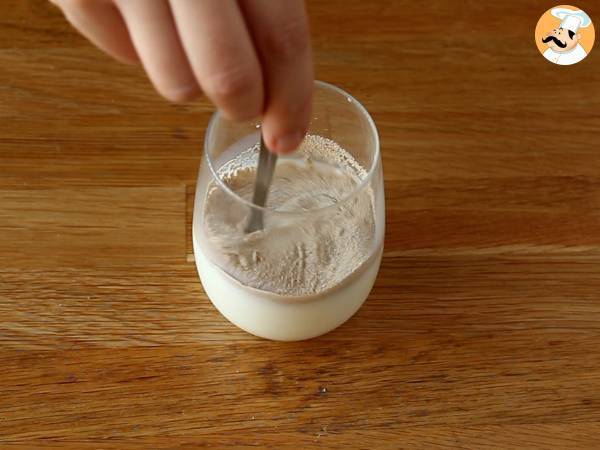 Mescolate il lievito di birra con il latte tiepido. Poi lasciate riposare 10 minuti a temperatura ambiente.