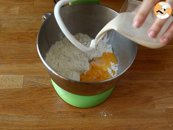 Mettete la farina nella ciotola della planetaria. Aggiungete lo zucchero ed il sale su un lato, poi ricoprite con la farina. A questo punto aggiungete le uova e la preparazione latte/lievito.