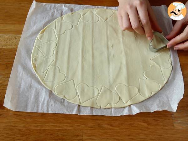 Stendete la pasta sfoglia e ricavate dei cuori con lo stampo