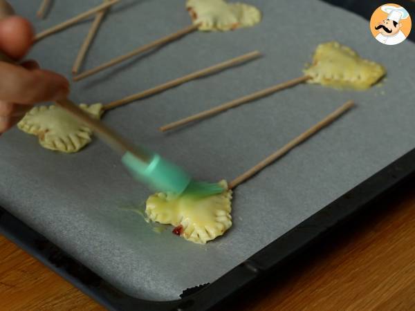 Ripetete l'operazione per preparare gli altri pie pops. Poi adagiateli su una leccarda ricoperta da carta da forno e spennellateli con la preparazione uovo/latte.