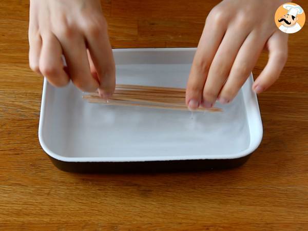 Mettete in ammollo gli stecchini in acqua fredda per 15 minuti per evitare che si brucino durante la cottura. Passato questo tempo, riprendeteli ed asciugateli con la carta assorbente.