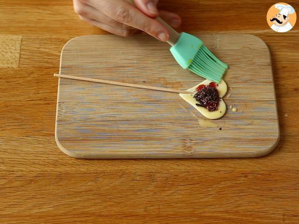 Adesso mette uno stecchino nel centro del cuore di pasta sfoglia. Spalmate sulla sfoglia un po' di confettura di lamponi, poi mettete qualche scaglia di cioccolato. Per finire spennellate i bordi vuoti con la preparazione uovo/latte.