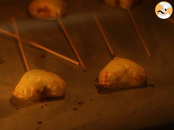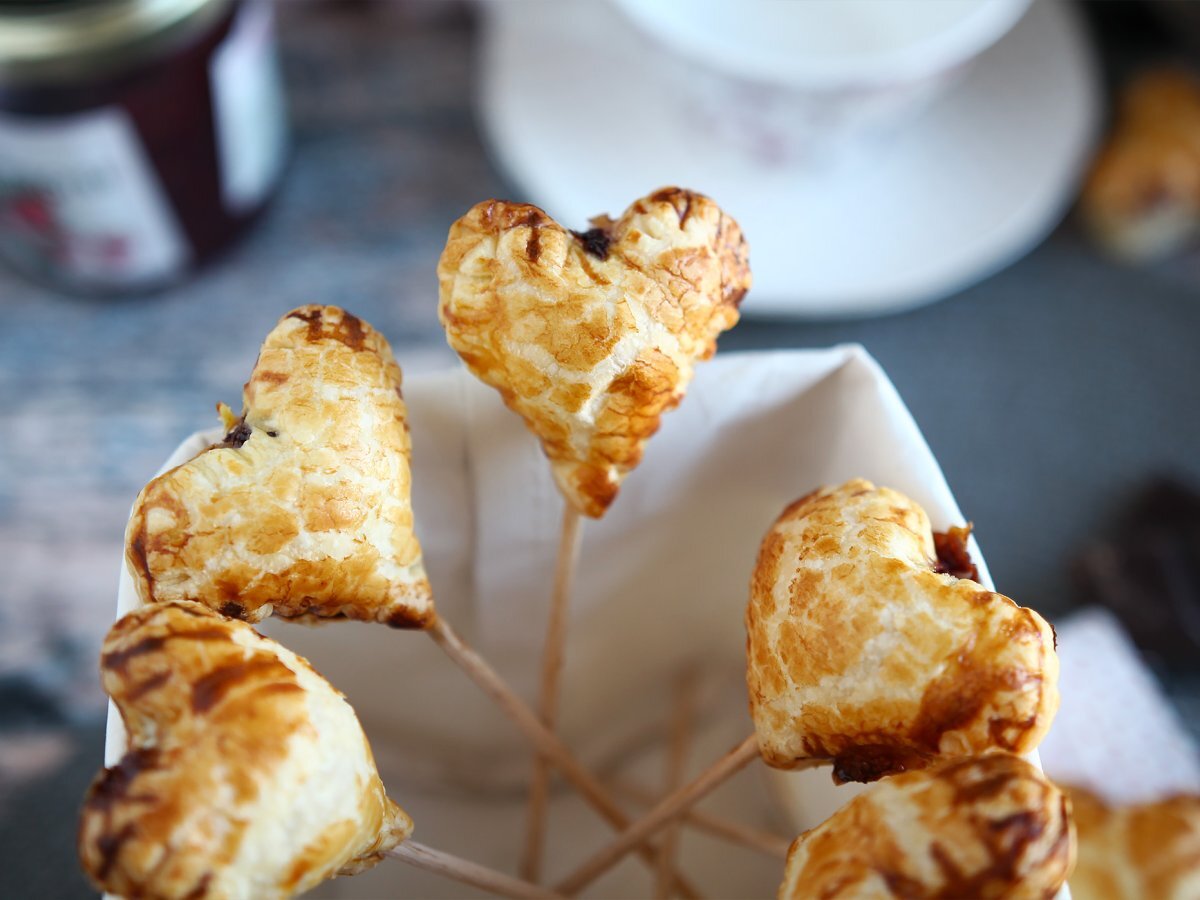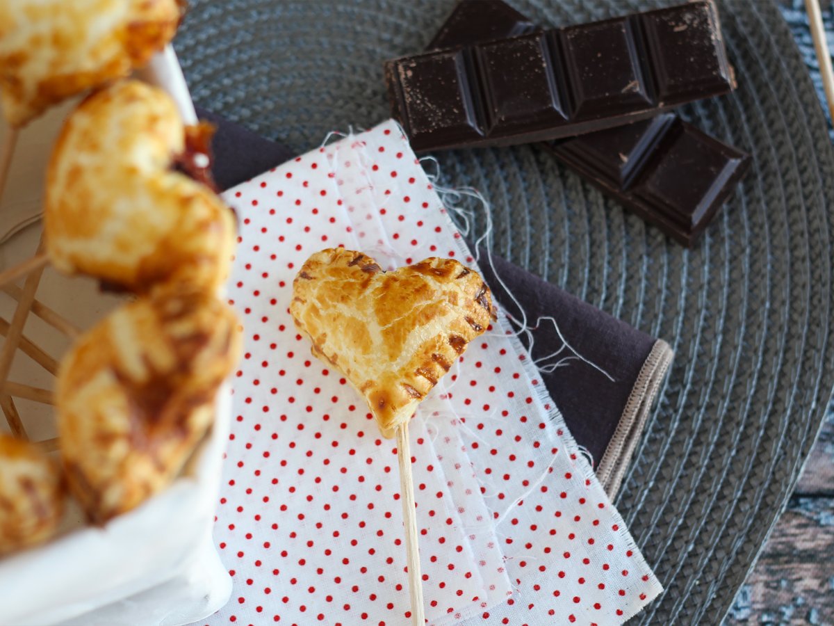 Cuori di sfoglia su stecco con cioccolato e confettura di lamponi - heart pie pops