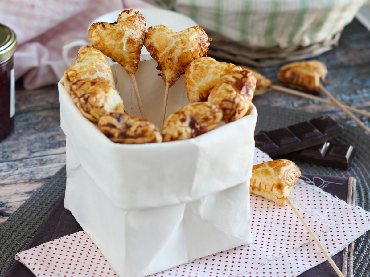 I golosi cuori di sfoglia presentati come dei lecca lecca. All'interno un dolce ripieno di cioccolato e confettura di lamponi: una vera delizia per San Valentino. Provate subito i nostri Heart Pie Pops, vi spieghiamo il procedimento passo a passo!