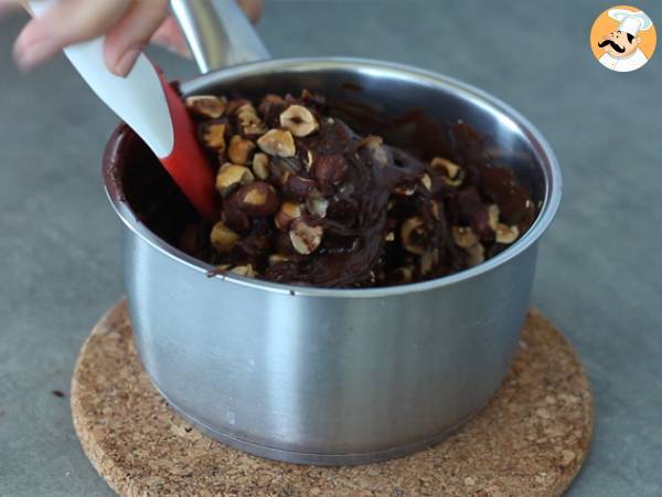 Sciogliete il cioccolato a bagno maria, toglietelo dal fuoco ed incorporate il latte condensato. Aggiungete l'estratto di vaniglia e mescolate per bene. A questo punto aggiungete anche le nocciole tritate.