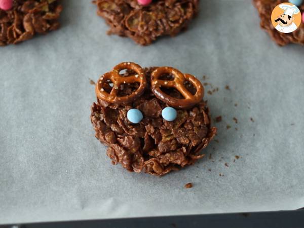Passato questo tempo, sciogliete i 3 quadratini di cioccolato e inzuppaci la base dei mini bretzel. Adagiatene due sulla parte superiore di ogni galletta per formare le corna delle renne.