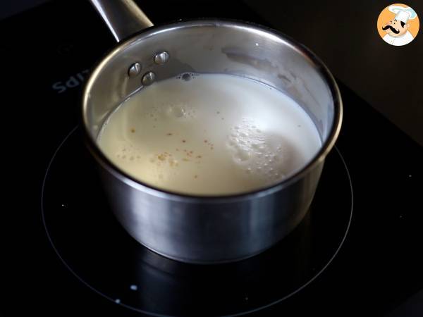 Portate ad ebollizione il latte, lo zucchero e la vaniglia in un pentolino